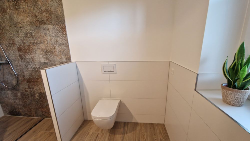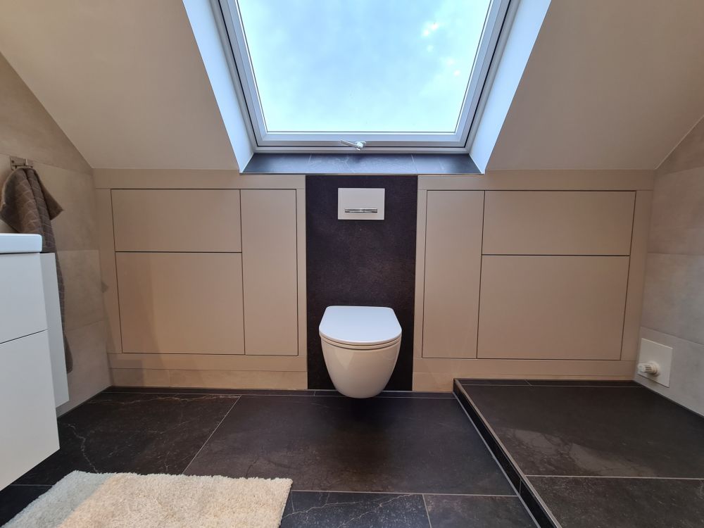 Im Zuge der Sanierung einer DHH haben wir auch das Badezimmer verschönert. Der vorhandenen Dachschräge wurde durch Einbringung einer Trockenbauwand eine Nischenlösung eingebaut.
