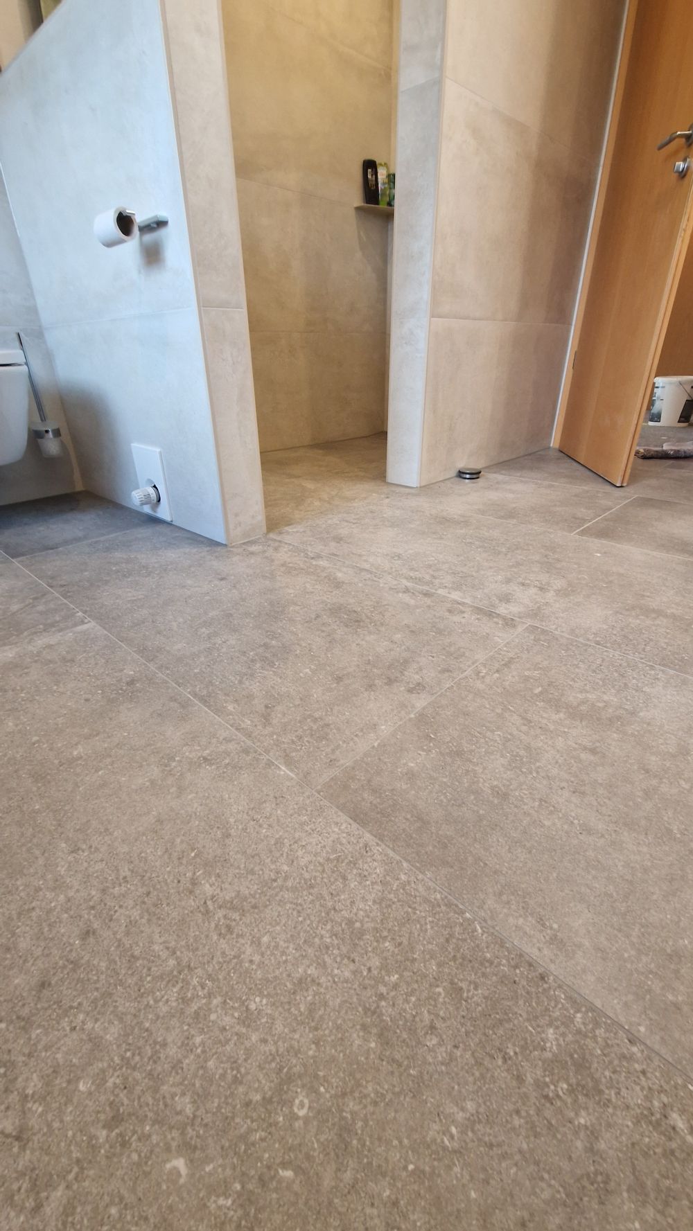 Bei der Sanierung dieses Bdezimmers haben unsere Kunden mit der Wahl der Bodenfliese einen starken Akzent gesetzt. Durch die Wahl des Großformates kommt der Industrial-Stil perfekt zur geltung.